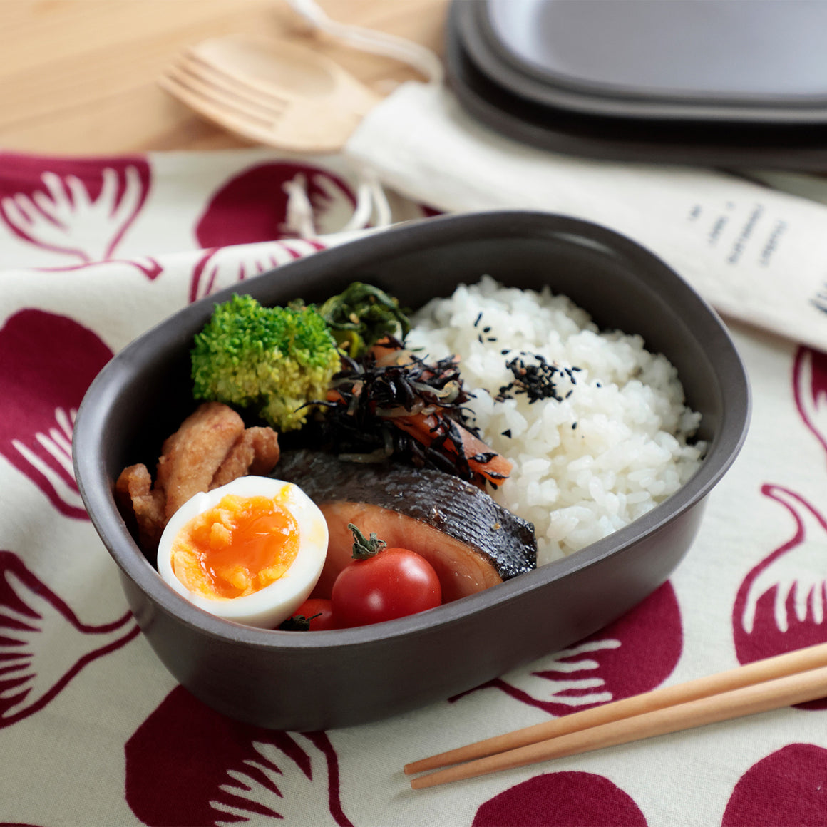 コーヒーを再生したお弁当箱 弁当コンサルタント・野上氏の「環境への想い」から生まれた、”コーヒーかす”と”竹の粉”を使用した植物由来素材のお弁当箱。汚れが落としやすい曲げわっぱ型の丸みを帯びたデザインが特徴的。 |