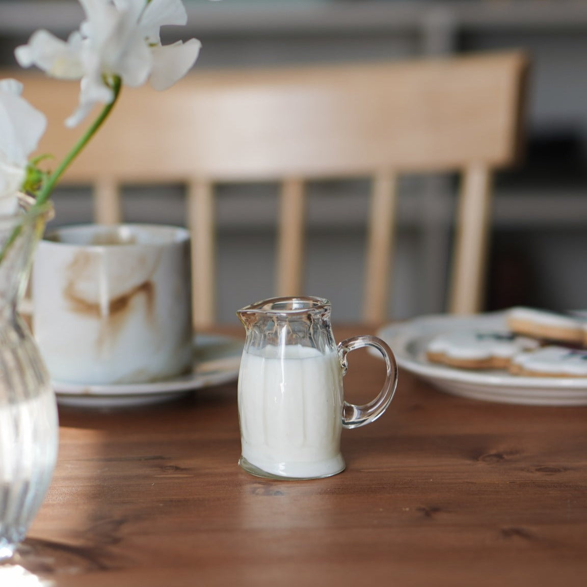 再生ガラスから生まれたミニピッチャー。コーヒーや紅茶のミルク入れ、かき氷のシロップや、ドレッシングやソース入れなどにぴったりのサイズ感です。一つ一つ職人が作った、手仕事ならではの質感や、底が広いぽってりとしたシルエットにうっとり。