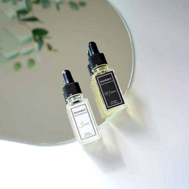 moment.のハンドオイルはとても可愛らしいサイズ感。おうちでのケアに使うことはもちろん、カバンに入れて持ち運べる使いやすいハンドオイルです。ケアの時間に合わせて使い分けられる、昼ケア用の【SUN】、夜ケア用の【MOON】の2種類をご用意。使うたび指先が美しく整い、自信を持って見せることのできる手元に変えてくれます。精油の香りで癒し効果も抜群、働く女性へおすすめしたい、頑張る自分の相棒になってくれるアイテム。