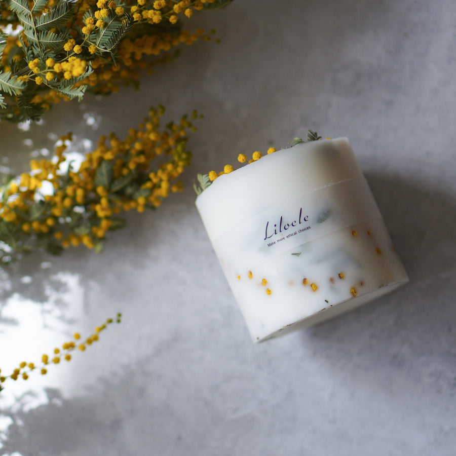 【季節のお花限定】ソイキャンドル 春を知らせる鮮やかな”ミモザ”が主役のキャンドル。3種類の中からお好きな香りを選んでいただけます。 |