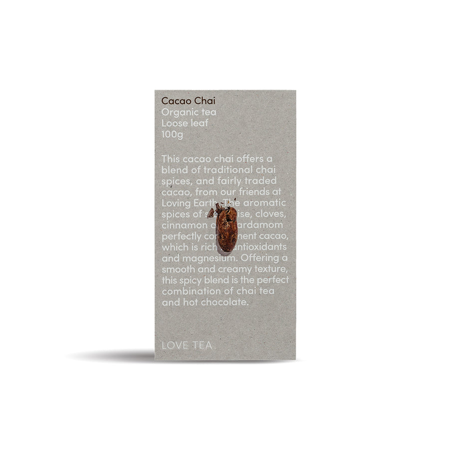 スパイスティーにオーストラリアのチョコレートブランド・Loving Earthのオーガニックカカオをブレンドした「カカオチャイ」。初めはホットチョコレートの甘い香り、そして後から紅茶とスパイスが重なる意外な組み合わせは、きっと初めての味わい。チョコレートが好きな方・チャイが好きな方は見逃せない、チャイの新たな楽しみ方です。