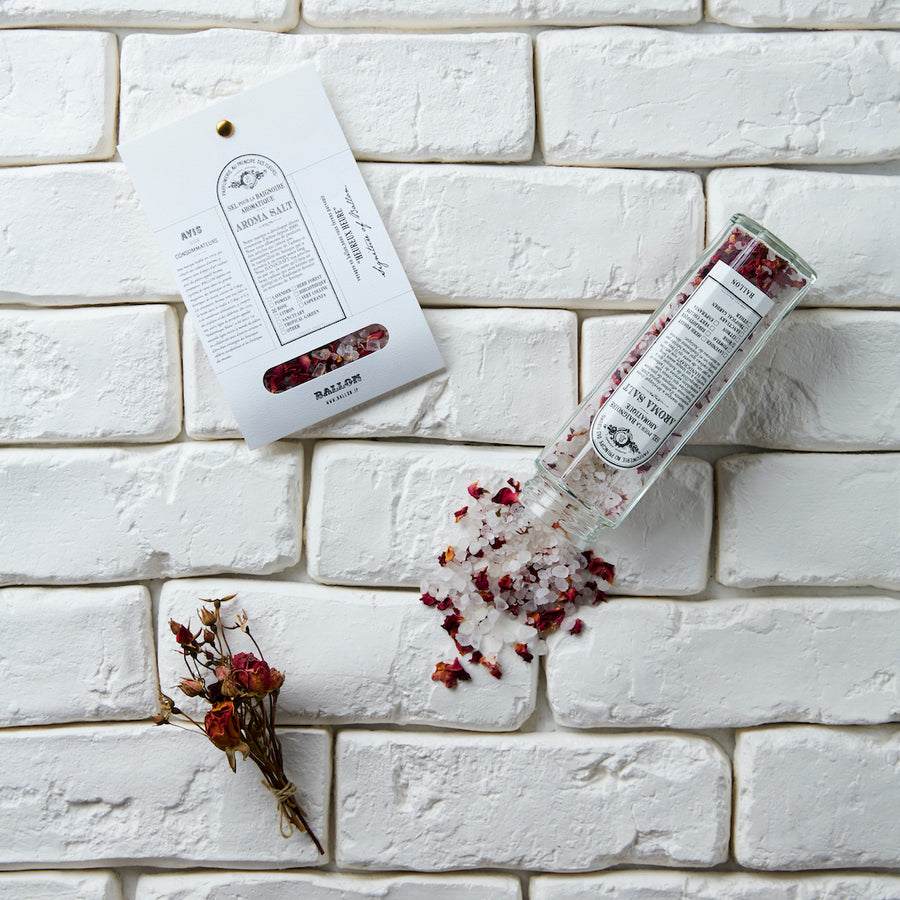 ハーブや花々が直接入っている、色鮮やかなバスソルト。ご自身用としてはもちろん大切な方への贈り物にもおすすめです。フレーバーは4種類・サイズは2タイプ(1回用:写真左、BOTTLE:写真右)でご用意しておりますので、用途に合わせてお選びください。