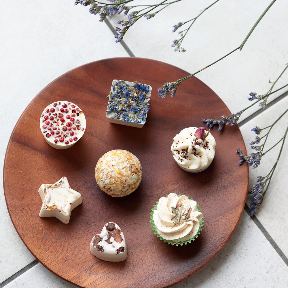 全て口に入れても問題のない成分で作られているので、料理に使うまな板と包丁を使っていただいても安心です。カットしやすい方法で分割しご使用ください。バスボムの種類によっては花びら等がついているものがございます。