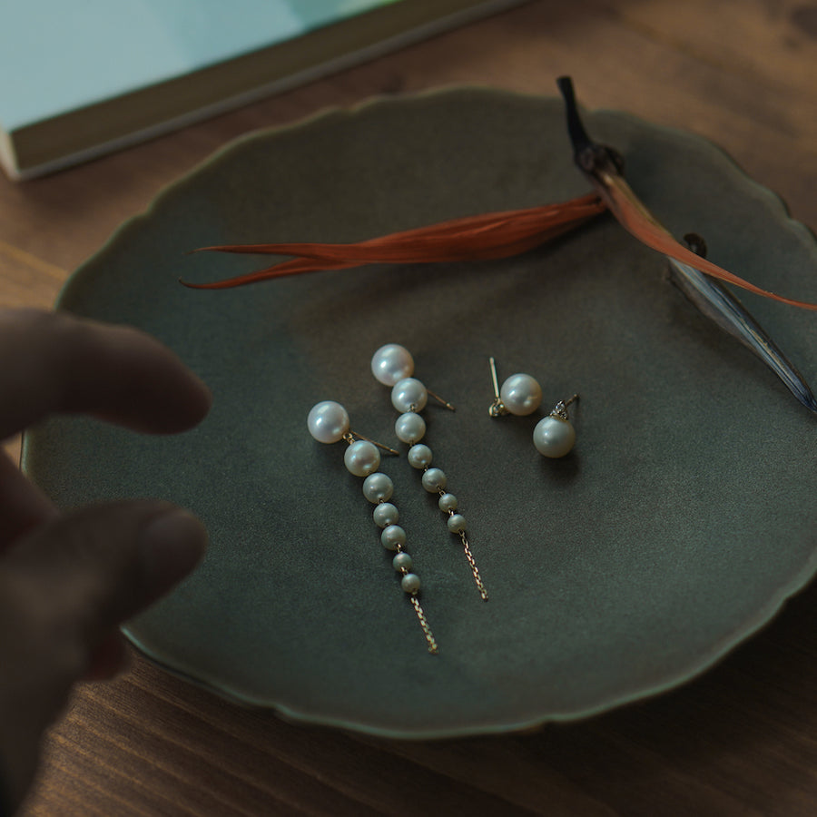 大きさの異なる7粒のパールを連ねた凛としたデザインのパールピアス。遠くからでも目を引くボリュームと上品な佇まいが高級感を演出。ラグジュアリーと個性が共存する唯一無二の魅力は、シンプルな装いを格上げさせます。