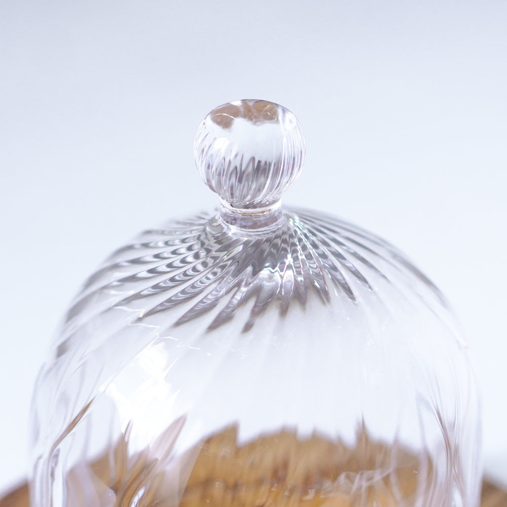 ガラス工芸作家・大内学さんの手がけたガラスドーム。吹きガラスという伝統技法で一つひとつ手作業で作られています。ドーム部分は縦ライン凹凸があり、すっきりとしたエレガントな印象ですが、持ち手をぽってりとした球体にすることで温かみが生まれ、食卓を華やげてくれます。