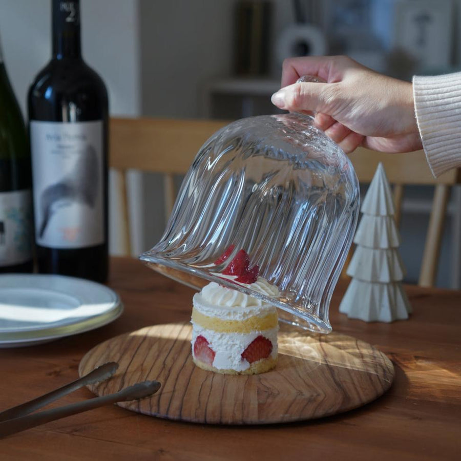 ケーキや焼き菓子を入れて、自宅がまるでお洒落カフェのように演出できるガラスドーム。絶対に必要なものではないけれど、そこにあるだけで心がはずむ一品です。高さ約17cm、幅約14cmほどの大きさなので、お持ちのお皿などに合わせて色々楽しんでいただけるかと思います。