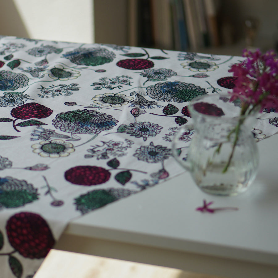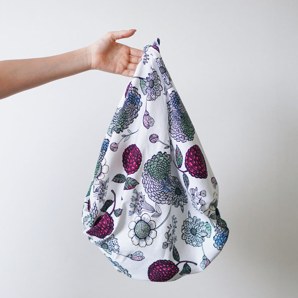 多くの花がデザインされた風呂敷【Milja(ミリヤ)】は、女性らしい繊細なラインが特徴。カラフルな色使いにもかかわらず、上品でシックな佇まいは、生地選び・染め・仕上げに至るまで、職人のこだわりがあってこその一品です。