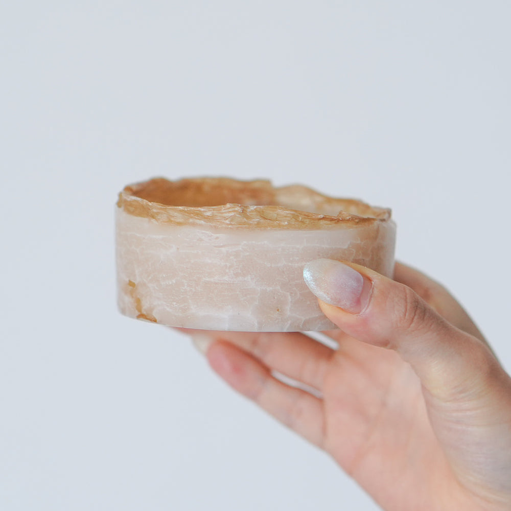 私が初めて落合さんの作品を手に取った時、写真で見ただけでは気づかなかった「ぬくもり」を感じました。天然色素が生み出した絶妙な色合いと、作品によって変化する蝋の質感。月に咲く花のような、手の届かぬ存在なように見えて、すっと手に馴染む。そしてどこか素朴さも感じる。不思議な魅力を感じたのを覚えています。