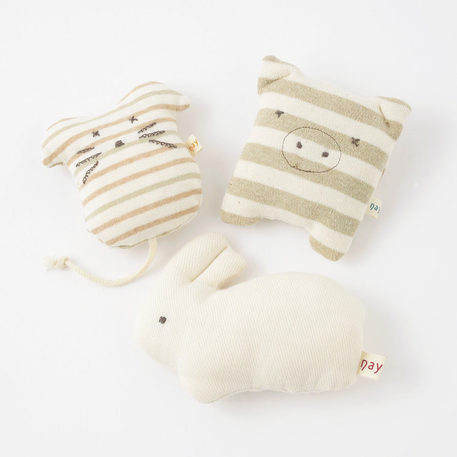 デザインはぶたさん・ねずみさん・うさぎさんの3種類の動物をご用意。作るための布は、前田源商店で製造する洋服などのハギレを使用しているため、生地の色や柄が物によって異なります。さまざまな布を使用しているので、どんな柄が来るかは到着してからのお楽しみ。オーガニックコットンの自然な風合いを活かした色合いが多いので、素朴で可愛らしいぬいぐるみをお届けいたします。